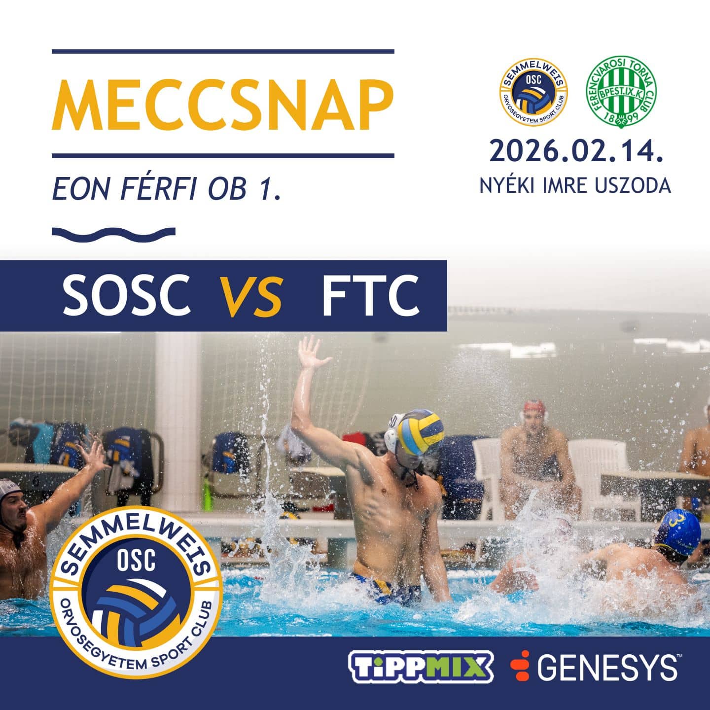 Nyéki Imre Uszoda", "startDate":"2026-02-14", "endDate":"2026-02-14", "startTime":"18:30", "endTime":"20:00", "location":"Budapest, Kondorosi út 14.", "options":["Apple","Google","iCal","Microsoft365", "MicrosoftTeams", "Outlook.com"], "timeZone":"Europe/Budapest", "iCalFileName":"Semmelweis OSC – Ferencváros (E.ON OB1)", "label":"Naptárba"}